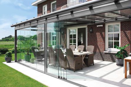 Das Glasdach von Lewens mit integrierter Aufdach-Markise für Terrassen und hausnahe Plätze bietet kombinierten Wetter- und Sonnenschutz.